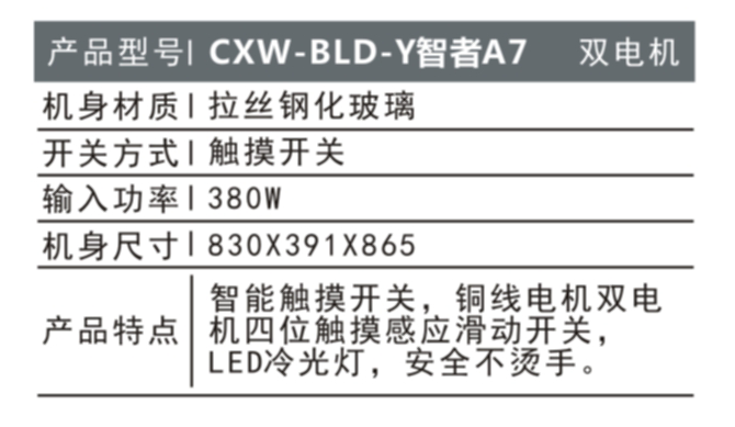 产品详情: 柏灵顿CXW-BLD-Y智者A7铜线双电机抽油烟机参数图